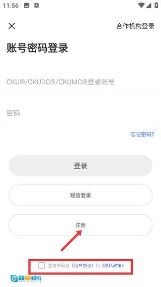 在账号密码登录页面,先勾选《用户协议》与《隐私政策》,接着点击“注册”按钮,即可进入注册流程。