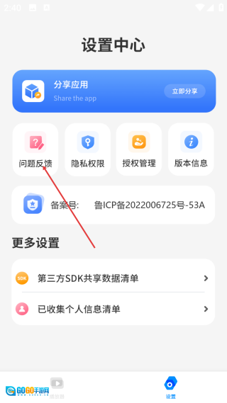 在设置中心页面,点击【问题反馈】选项,即可进入问题反馈的信息填写界面。