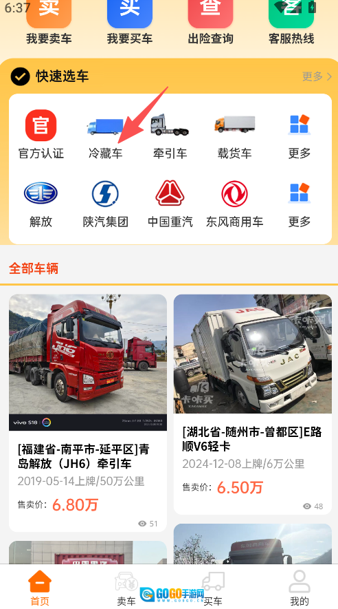 进入首页,在快速选车中选择对应车型如冷藏车。