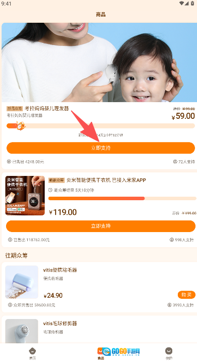 首页聚合呈现多元创新产品,以商品流形式展示不同品类与阶段的众筹项目,像家居、科技等类别都包含其中。