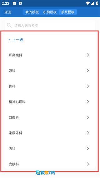在模板选择页面选好对应的科室(像【耳鼻喉科】这类),就能看到这个科室里具体的病历模板了。