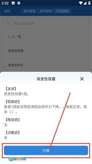 当你选中想要使用的病历模板(例如【突发性耳聋】这类),接着点击【引用】按钮,模板里的内容就会自动导入到当前病历当中了。