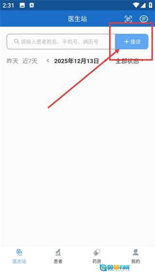 在医生站页面点击【+接诊】按钮,即可进入病历书写界面,着手记录患者的就诊信息。