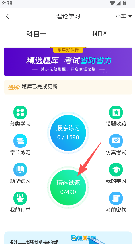 在理论学习页,选择精选试题功能。