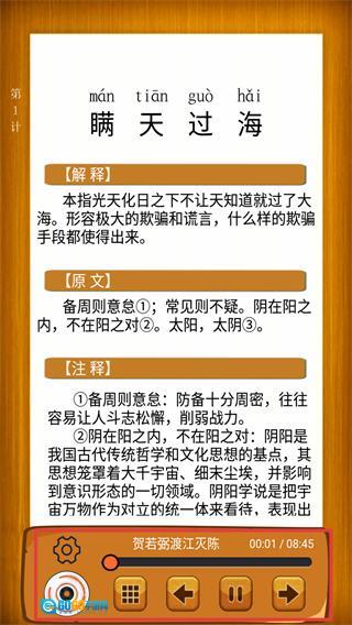 进入【第1计-瞒天过海】的详情页面,你可以查看该计策的解释、原文和注释,还能通过操作页面底部的播放条,收听与之对应的故事内容。