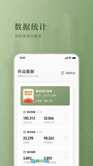 数据查看功能涵盖作品每日数据、每日收益、每月稿费等内容的查看