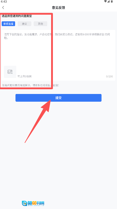 进入“意见反馈”页填写内容后点击“提交”按钮。