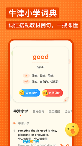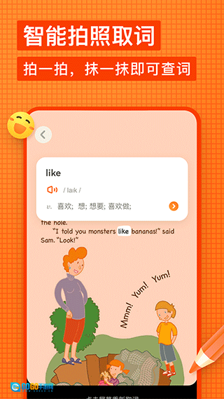 英文查词功能会给出详尽的词义解释,还配有贴合少儿日常生活场景的典型例句,同时附上自然拼读标注和标准发音,助力孩子扎实打好英文基础。