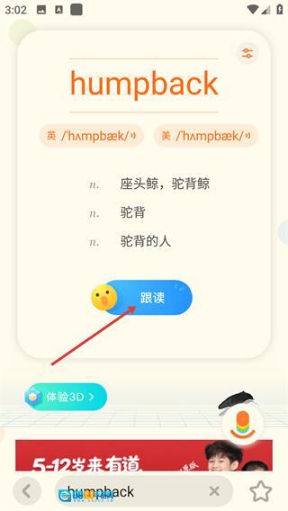 进入【humpback】的详情页面,就能查看这个单词的英、美发音以及释义,点击页面上的【跟读】按钮,还可以练习它的发音。
