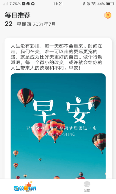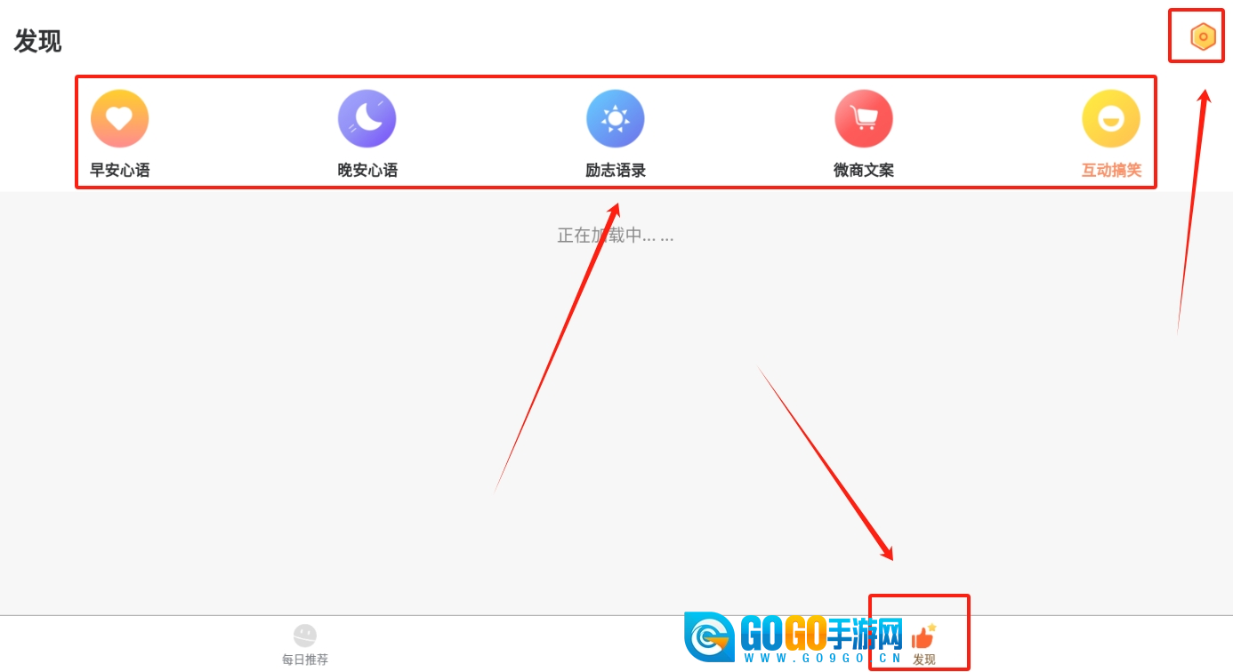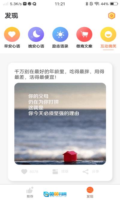 点击发现页面,就能看到分类整理好的早晚安心语、励志名言、微商文案以及搞笑段子等各类内容。