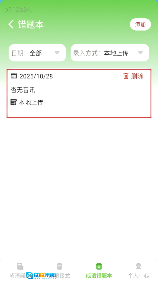 保存操作完成后回到错题本页面,就能看到之前记录下来的错题,这样后续就可以专门针对成语类错题开展复习和巩固了。