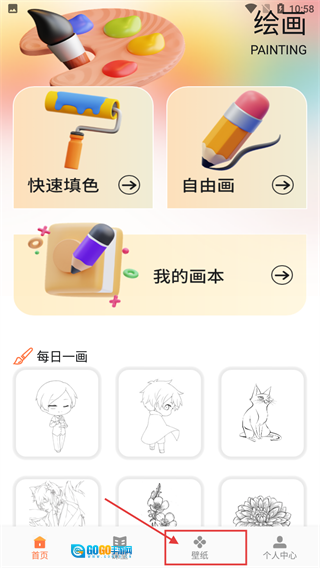 在绘画首页,点击底部的【壁纸】选项,即可进入壁纸板块。