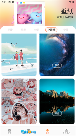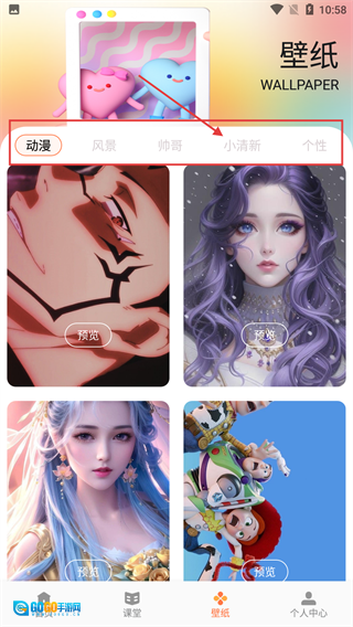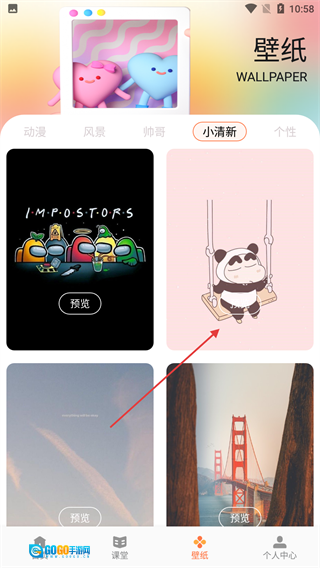 进入壁纸板块后,能选择【动漫】【风景】【小清新】这类分类,这里拿【小清新】举例,点击这个分类标签。