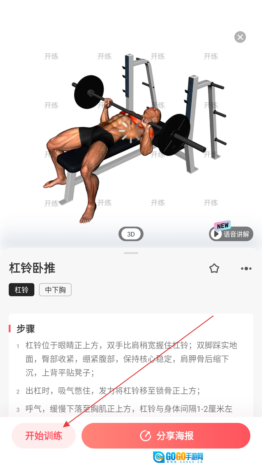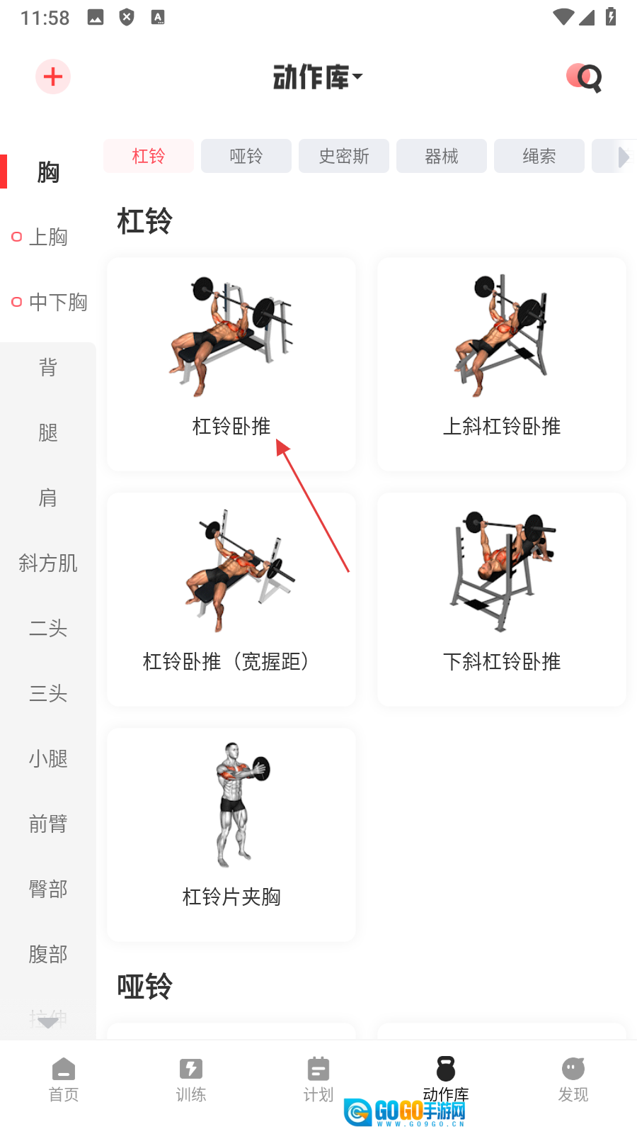 在动作库页面,找到并点击【杠铃卧推】选项,即可进入该动作的详情页面。