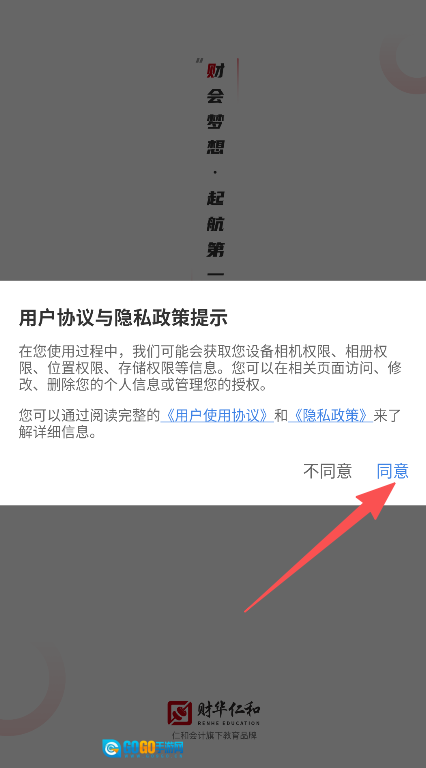 首次打开应用时,在弹出的用户协议和隐私政策提示界面点击“同意”按钮。