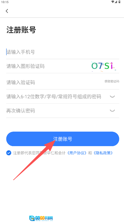 在界面中填写手机号、验证码和密码等信息后,点击“注册账号”按钮。