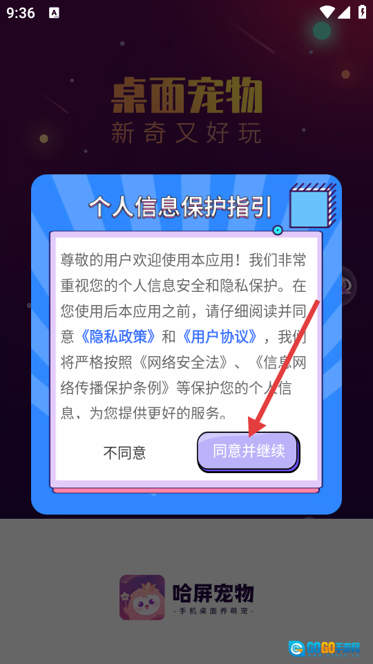 在个人信息保护指引的弹窗里,点击【同意并继续】按钮,就能进入应用的主界面了。