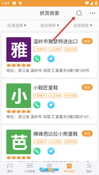 在供货商家页面,点击右上角的搜索图标,进入搜索页面。