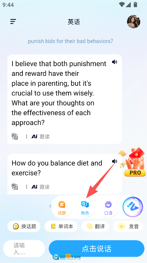 支持AI跟读功能,在交流话题板块,能跟着内容开展英语朗读练习。