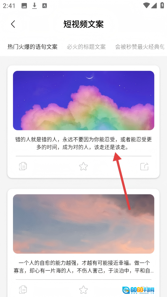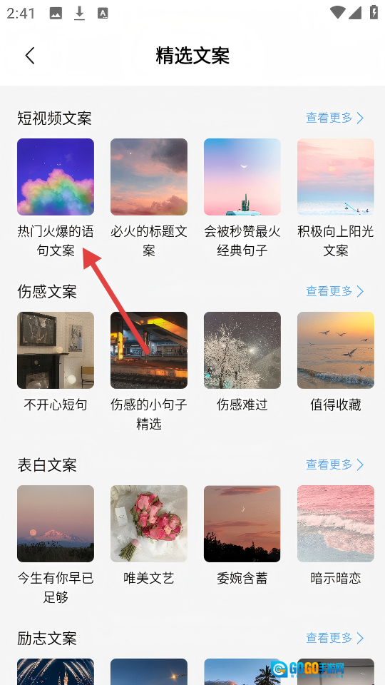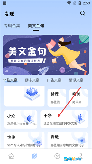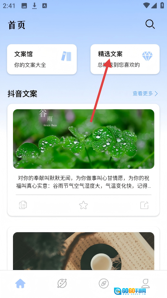在首页点击【精选文案】,进入精选文案页面。