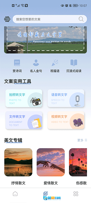 文案馆是一款专注于为用户提供文案语录的实用工具,这里汇聚了海量的文案句子,并且会对其中的优质句子进行在线整理汇总,让用户能够轻松实现对短句美文的一键摘录。用户还可以详细了解每一条文案的出处以及作者信息,在线感受各类文学好句的魅力,同时能便捷地筛选出自己所需的内容。此外,平台支持用户创建专属的文案合集,用户可以品读各类专辑文案,享受优质文案的阅读体验,从而助力自己汲取文案中蕴含的能量与知识,保持积极向上的生活方式。