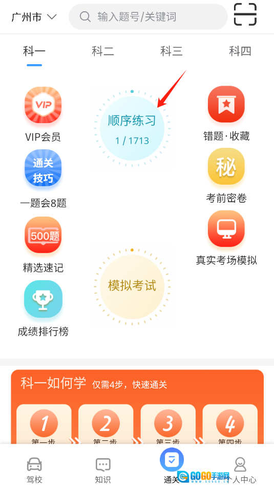 打开,选择科目一点击顺序练习,进入刷题环节。