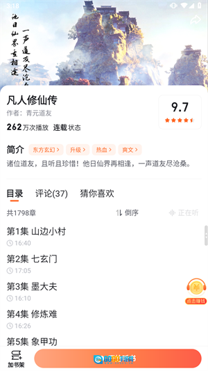 可以查看小说的详细信息,挑选自己感兴趣的章节,然后点击“开始听书”即可。
