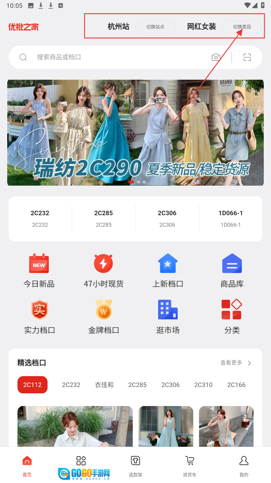 打开优批之家应用,点击顶部的【切换类目】按钮,进入类目选择页面。