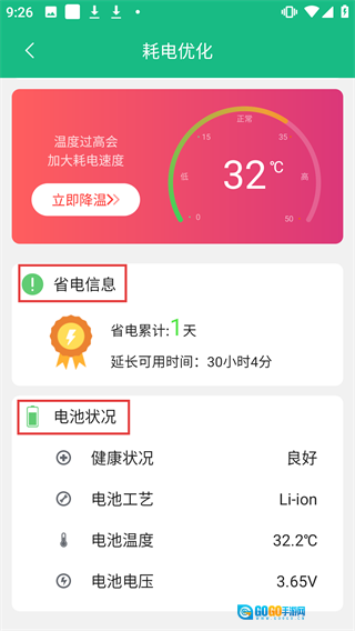 进入【耗电优化】界面后,能查看【省电信息】与【电池状况】,从而知晓省电累计时长、电池健康等相关内容。