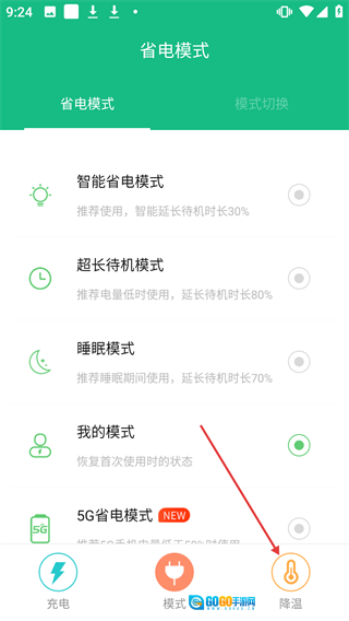 在【省电模式】界面中,点击右下角的【降温】图标,就能进入手机的降温功能页面。
