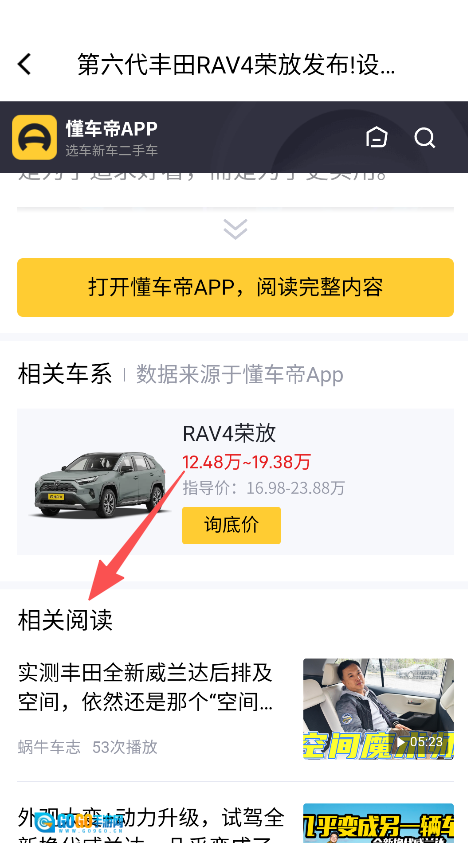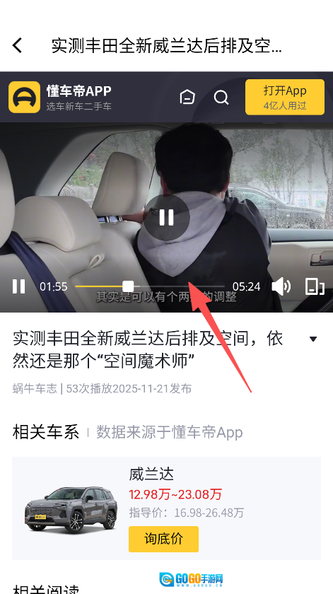 点击相关阅读板块里的视频,观看汽车的实际测试内容,从而了解车辆空间等方面的信息。