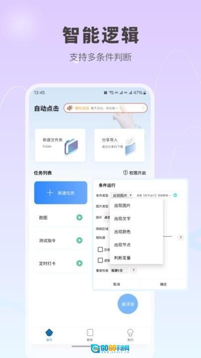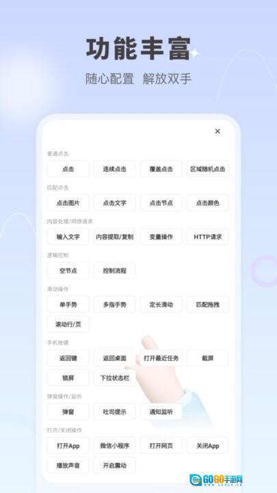 纯净高效,免root自动点击,类似按键精灵,可做连点器,可以随心配置的流程执行,无任何限制,自由发挥想象,任何场景都能使用,能够定点执行,也可固定时间重复执行,可以用于自动收能量,打卡,刷图,抢单等等,只要你想得到,都能做到。