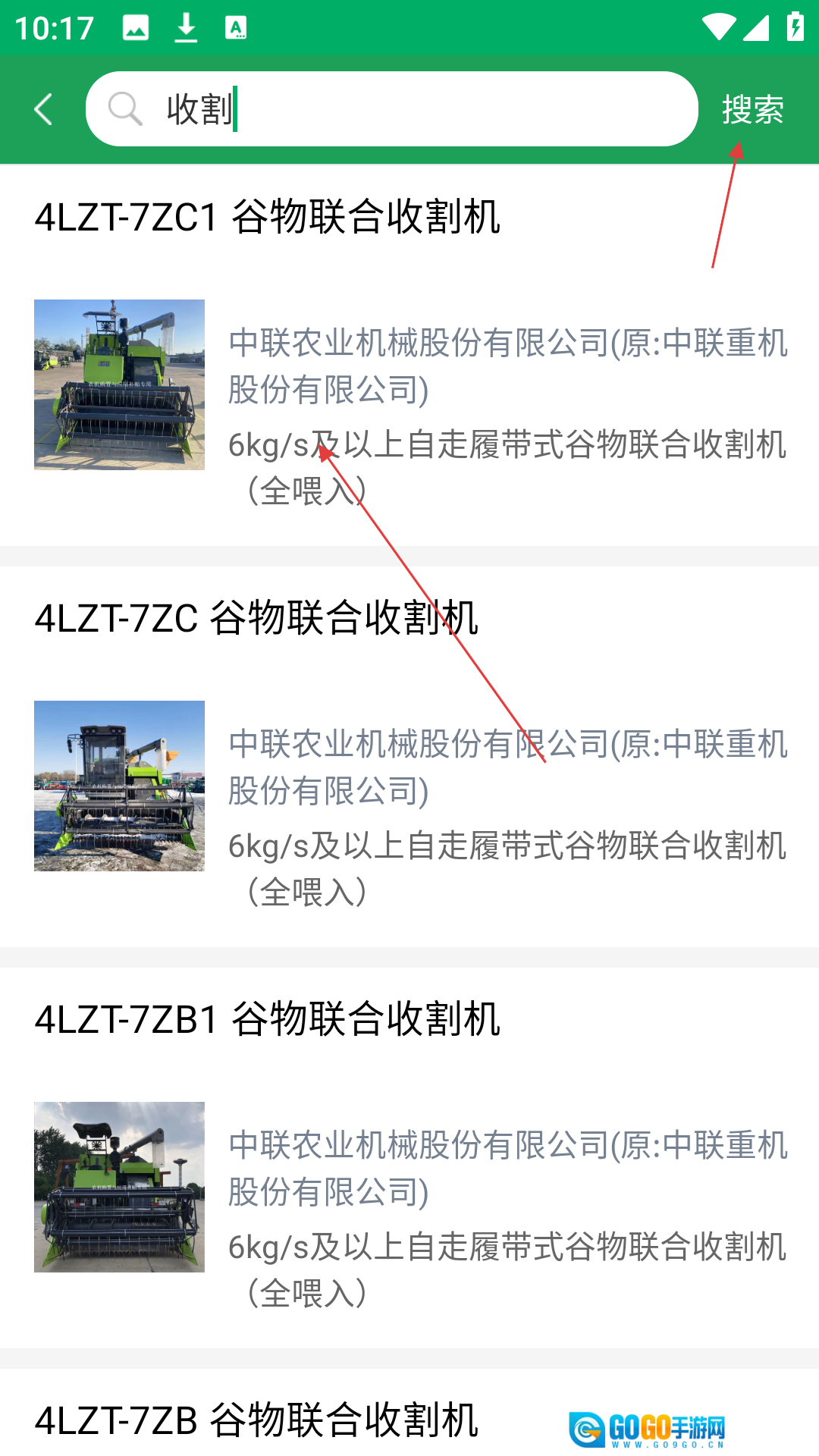 在搜索框输入“收割”进行搜索后,点击【目标农机】选项即可进入详情页面。