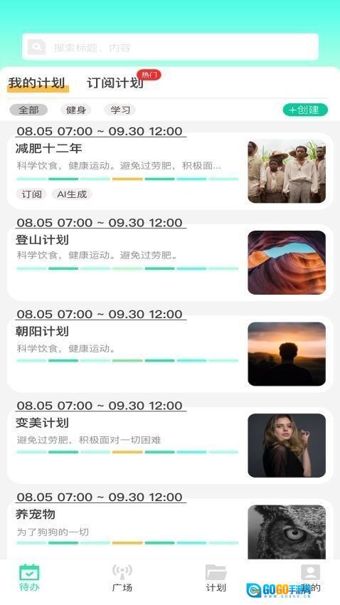 和“计划废纸”说再见,拥抱高效生活!一键订阅学霸/大神的优质计划,让坚持变得超轻松。小绿皮AI实时分析任务合理性,像贴心教练一样为你加油鼓劲!万人广场见证你的每一步成长,从此自律不再孤单。现在,开启你的高效人生!