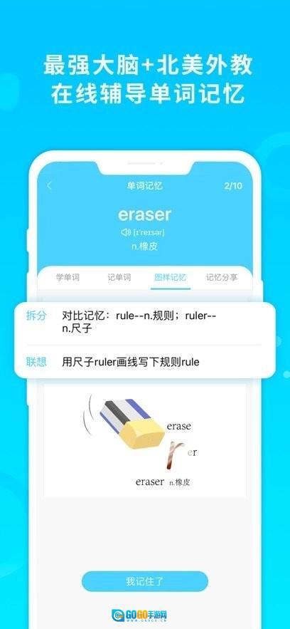 这是一款助力中国1亿中小学生提升学习记忆效率的软件。每个单词都配备了外教发音示范与讲解、自然拼读规则指导、英文释义以及实用例句;此外,还融入了记忆大师精心设计的图解和视频解析内容,帮助学生在观看图片和视频的过程中,轻松掌握单词及其相关知识点。
