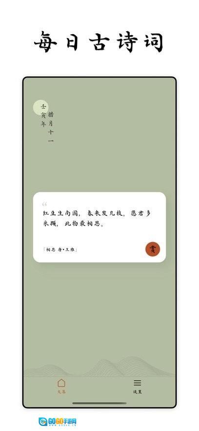 - App 每天会推荐一首诗词,可能是经典的唐诗,也可能是优雅的宋词抑或其他,当让你可以看到诗词赏析、作者解读、诗词解释等内容