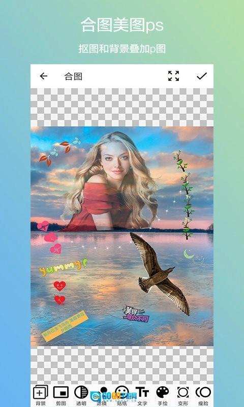 7、合图功能:将抠取的图像与背景进行叠加,合成全新的图片,支持更换图片、背景、人像及头像。此外,还可对图片进行滤镜调整、添加贴纸与文字、手绘创作、设置透明效果、更换背景图或背景色,以及进行PS变形拉伸等操作。