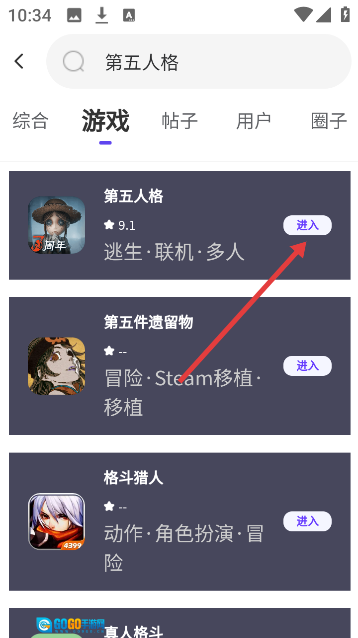 在游戏列表页面找到目标游戏,点击其对应的【进入】按钮,即可进入该游戏的详情页面。