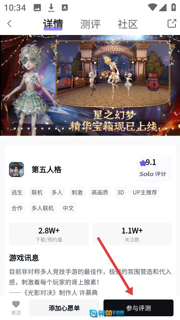 在游戏详情页面找到【参与评测】按钮并点击,接着完成游戏评测的相关操作。