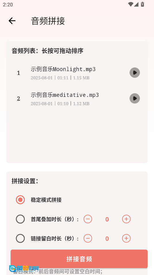 长按音频即可拖动调整顺序,选定拼接模式后,点击“拼接音频”按钮完成操作。