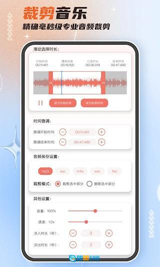 音频剪辑大师是一款多功能音频处理工具,支持MP3、WAV、AAC等主流格式的导入与导出,可实现毫秒级的精准剪辑、无缝拼接等操作,均衡器能自由调节音频效果,实时预览功能让调整过程更加精准高效,其界面设计简洁明了,无论是新手还是专业用户都能迅速掌握,轻松打造专属铃声或音乐作品。