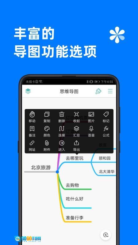 支持便捷的分支编辑功能,点击分支末端可扩展子分支,长按文本能弹出功能菜单,进而完成复制、剪切、删除、备注、标记等操作。