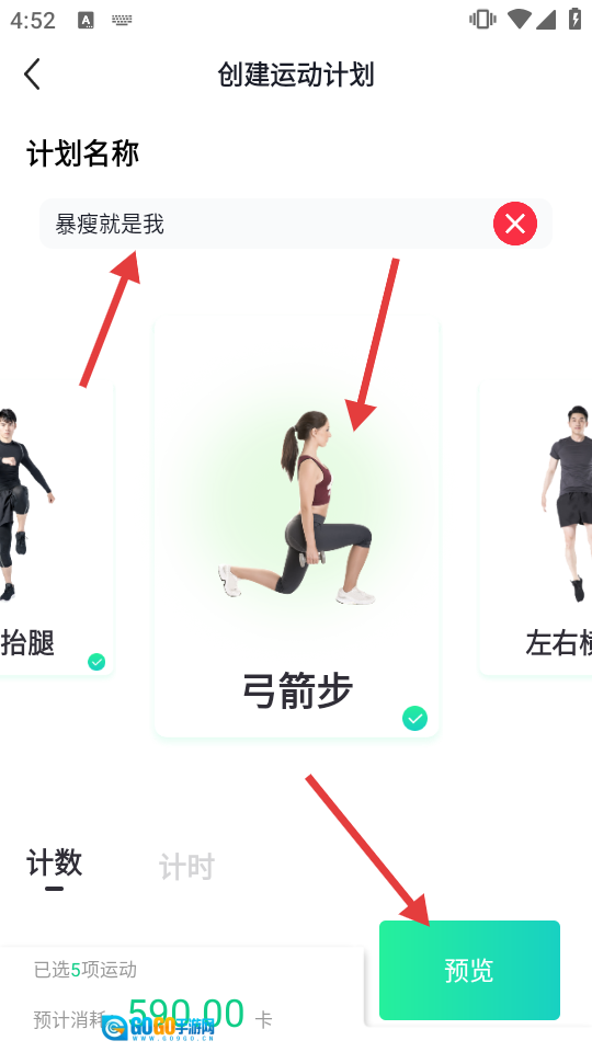 接下来输入【计划名称】,再依据个人的实际需求挑选合适的训练项目,之后点击【预览】按钮就能进入到下一步操作了。
