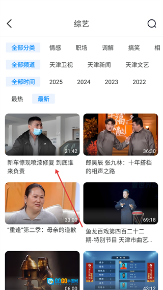 在综艺分类页面的【最新】标签中,找到标题为“新车惊现喷漆修复到底谁来负责”的视频,点击该视频进入播放页面。