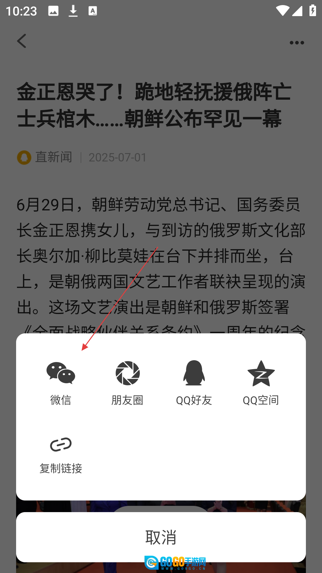在分享菜单中点击【微信】按钮完成文章分享操作。