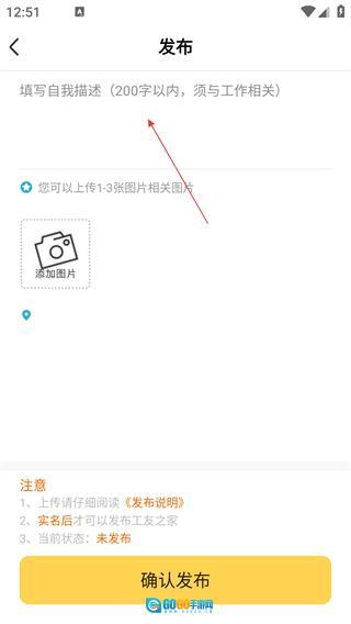 在发布页面,填写个人介绍内容,上传图片后点击【确认发布】按钮,即可完成发布流程。