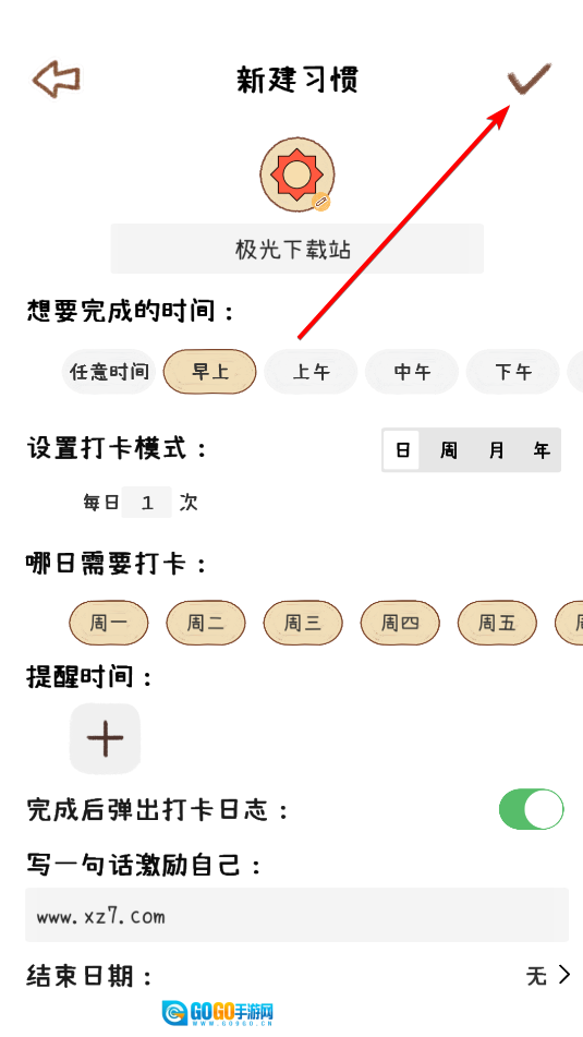 输入习惯名称,设置重复、提醒等规则,点击右上角按钮保存