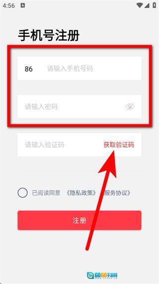 在手机号注册界面,填写手机号码、设置密码后,点击获取验证码按钮。