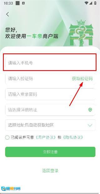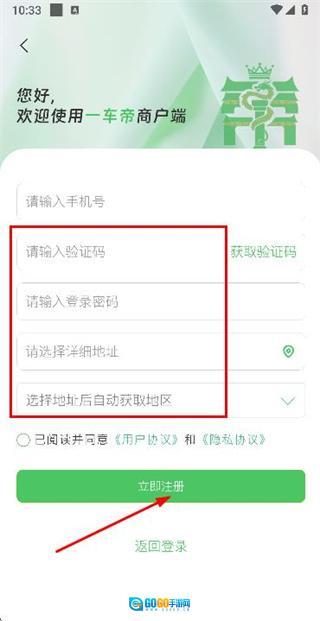 在账号注册页面依次填写验证码、密码与地址信息,勾选相关协议条款后,点击“立即注册”按钮即可完成注册流程。