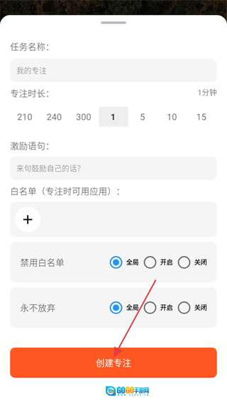 在填写页面设置任务名称、专注时长、激励语句等信息后,点击【创建专注】按钮。